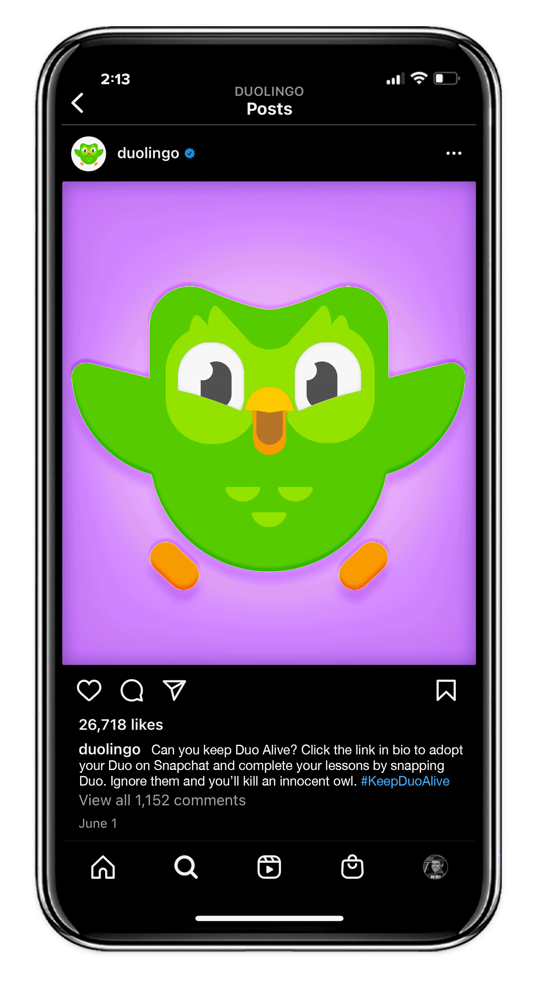 Once we’ve teased them enough, we’ll post on Instagram to announce the campaign with a link in the bio that adds Duo on Snapchat.